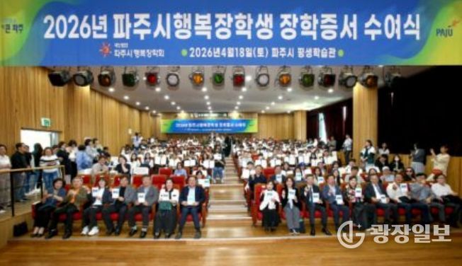 광장일보 주재영 기자 | 파주시는 (재)파주시행복장학회가 지난 18일 파주시 평생학습관 대공연장에서 학부모와 장학생 등 200여 명이 참석한 가운데 2026년 장학증서 수여식을 개최했다고 밝혔다.