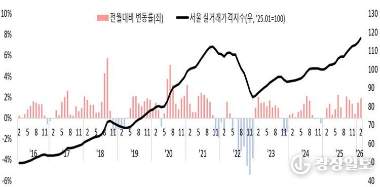 한편, 한국부동산원이 매주 조사·공표하는 주간 아파트 가격지수는 2월 당시 상승세가 점차 둔화되는 모습을 보였으나, 2월 실거래 전수를 기반으로 산출한 실거래가격지수는 오히려 1월 대비 상승폭이 확대된 것으로 나타나 두 지수 간 상이한 흐름이 확인됐다.