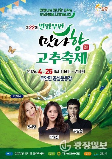 광장일보 주재영 기자 | 경남 밀양시는 오는 25일 무안면 공설운동장 일원에서 ‘제22회 밀양무안맛나향 고추 축제’를 개최한다.