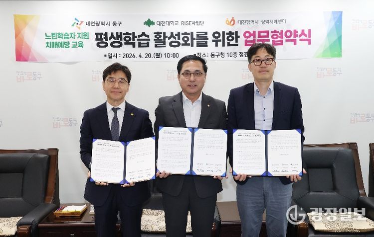 광장일보 나학천 기자 | 대전 동구는 20일 대전대학교 RISE사업단‧대전시치매센터와 ‘느린학습자 평생교육 지원’과 ‘치매예방 프로그램 운영’을 위한 업무협약을 체결했다고 밝혔다.