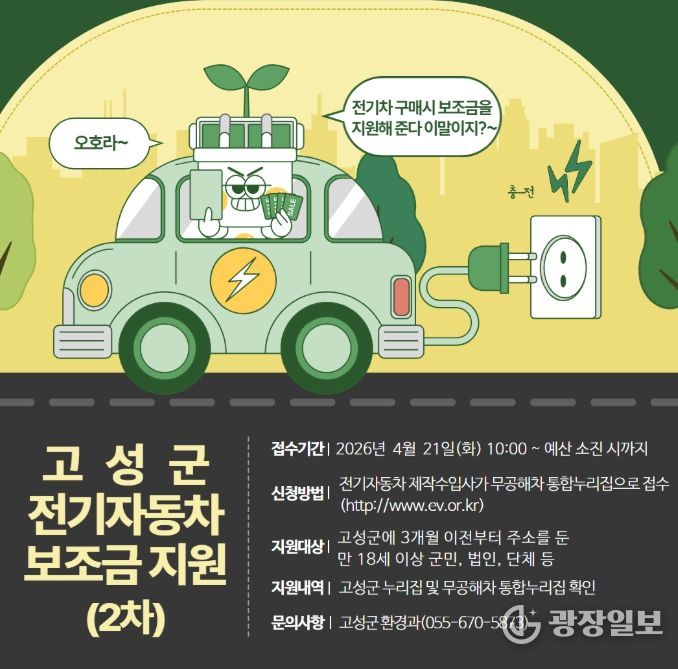 광장일보 주재영 기자 | 고성군은 4월 21일부터 전기자동차 보급사업 2차 신청을 앞당겨 추진한다고 밝혔다. 전기자동차 수요 증가와 대기질 개선에 대응하기 위한 조치다.