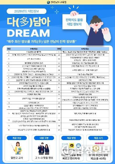 광장일보 주재영 기자 | 전라남도교육청이 급변하는 대입 환경에 선제적으로 대응하고 학교 현장의 진학지도 역량을 강화하기 위해 맞춤형 대입 정보지 ‘다(多)담아 DREAM’을 발간·운영한다.