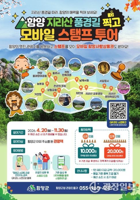 군 관계자는 “이번 모바일 스탬프 투어는 관광객이 함양의 주요 명소를 직접 방문하며 지역의 매력을 자연스럽게 체험할 수 있도록 마련한 참여형 관광 프로그램”이라며 “많은 관광객이 지리산 풍경길과 함양의 아름다운 관광지를 둘러보며 특별한 추억도 만들고, 지역경제에도 활력을 더해 주시길 바란다”라고 말했다.