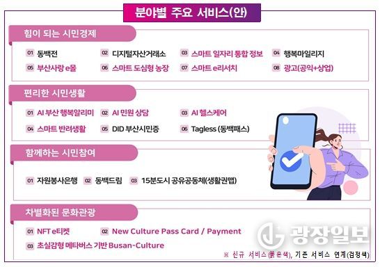 주요 서비스로는 ▲개인별 맞춤형 혜택을 알려주는 ‘인공지능(AI) 부산행복알리미’ ▲생성형 인공지능(AI) 기반의 ‘인공지능(AI)민원상담’ ▲개인 건강관리 ‘인공지능(AI) 헬스케어’ ▲‘스마트 일자리 통합 정보’ ▲‘스마트 반려생활’ ▲‘부산사랑e몰’ 등 디지털 지갑 기능을 포함한 20여 개 서비스를 하나의 앱에서 제공한다.