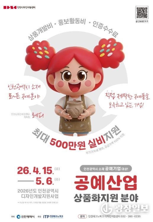 광장일보 주재영 기자 | 인천테크노파크(인천TP)는 인천 공예기업의 상품 경쟁력 강화를 위해 ‘2026년도 인천광역시 공예산업 상품화 지원사업’ 참여기업을 오는 5월 6일까지 모집한다.