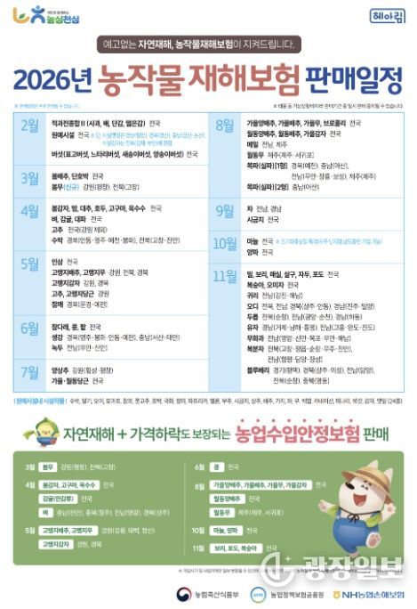 시 관계자는 “최근 태풍, 가뭄, 폭설 등 자연재해로 인한 농작물 피해가 반복되고 있는 만큼 안정적인 영농활동을 위해 농작물재해보험 가입이 중요하다”라며 “대상 농가에서는 기한 내 반드시 신청해 달라”라고 당부했다.