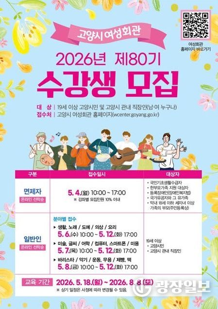 광장일보 주재영 기자 | 고양특례시 여성회관은 오는 5월 4일부터 12일까지 2026년 제80기 정규강좌 수강생을 모집한다.