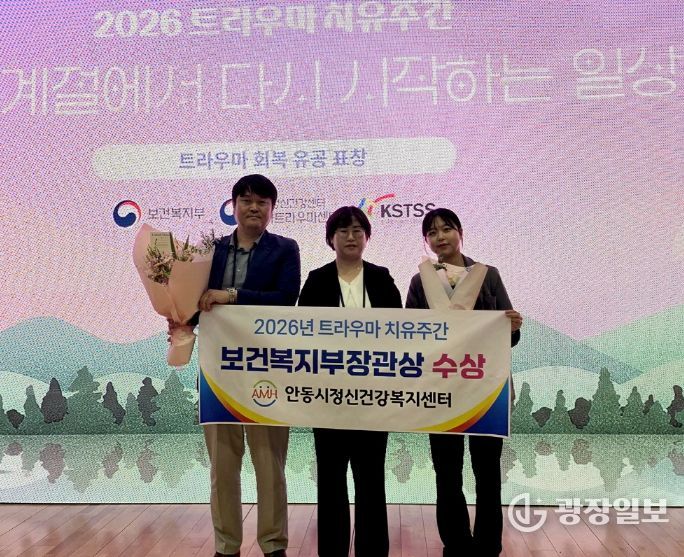 광장일보 주재영 기자 | 안동시정신건강복지센터는 20일 국립정신건강센터에서 열린 보건복지부 주최 ‘2026년 트라우마 치유주간’ 시상식에서, 산불 재난 경험자의 심리 회복을 위해 헌신한 공로를 인정받아 보건복지부 장관 표창을 수상했다고 밝혔다.
