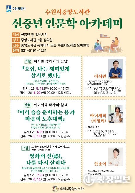광장일보 박균현 기자 | 수원시 중앙도서관이 5월부터 7월까지 매달 1회 운영하는 ‘신중년 인문학 아카데미’ 수강생을 모집한다.