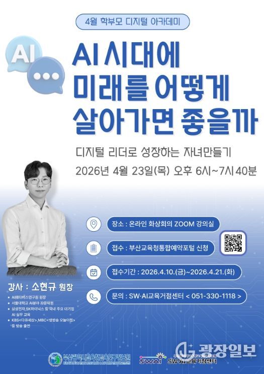 광장일보 주재영 기자 | 부산광역시교육청교육연구정보원은 오는 23일 관내 학부모와 시민을 대상으로 온라인(ZOOM)을 통해 4월 학부모 아카데미 ‘AI시대에 미래를 어떻게 살아가면 좋을까?’를 운영한다.