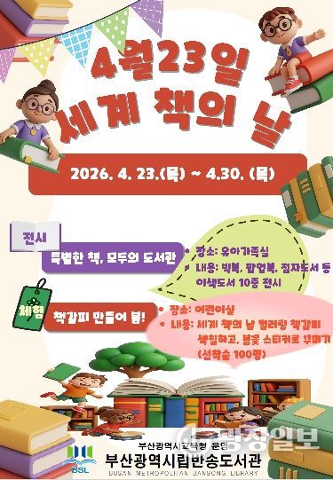 광장일보 주재영 기자 | 부산광역시립반송도서관은 세계 책의 날(4월 23일)을 맞아 오는 23일부터 30일까지 도서관 어린이실에서 유아와 초등학생을 대상으로 독서 문화 프로그램을 운영한다.