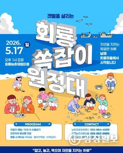 광장일보 주재영 기자 | 남해관광문화재단은 ‘2026 지역민 주도 소규모 축제 개최 지원 사업’의 일환으로 오는 5월 17일 일요일 오후 1시 ‘갯벌을 살리는 회룡 쏙잡이 원정대’ 축제를 개최한다.