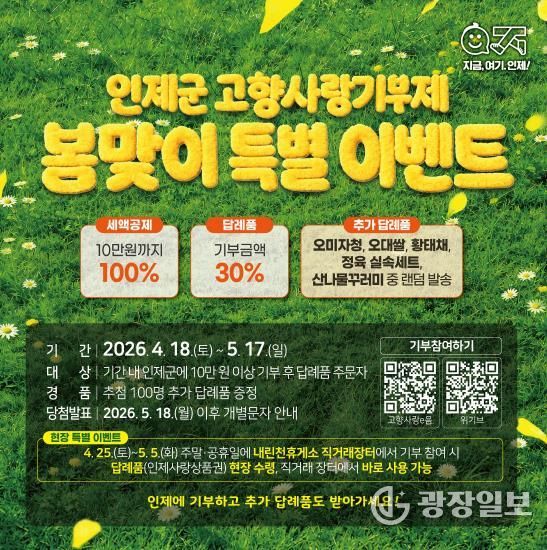 김장웅 인제군 지역발전과장은 “봄철 인제군을 찾는 방문객들에게 고향사랑기부제를 자연스럽게 알리고 참여를 독려하기 위해 이번 이벤트를 마련했다”며, “고향을 사랑하는 마음으로 기부하고 세액공제와 답례품 혜택은 물론, 지역 농특산물 소비 활성화에도 동참하는 뜻깊은 기회가 되길 바란다”고 말했다.