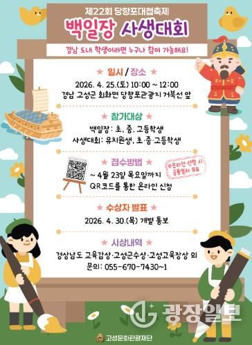 광장일보 주재영 기자 | 고성문화관광재단은 '제22회 당항포대첩축제' 기간 중 청소년과 가족이 함께 참여할 수 있는 체험형 역사교육 프로그램으로, 4월 25일 오전 10시 ‘경남학생 백일장·사생대회’와 오후 1시 ‘최태성과 함께하는 당항포대첩 – 두 번째 이야기’를 운영한다.