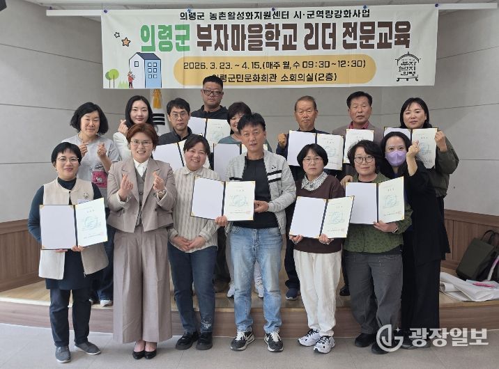 광장일보 주재영 기자 | 의령군은 지난 3월부터 추진해 온 ‘2026년 부자마을학교 리더 전문교육’을 마무리하고 12명의 수료생을 배출했다고 밝혔다.