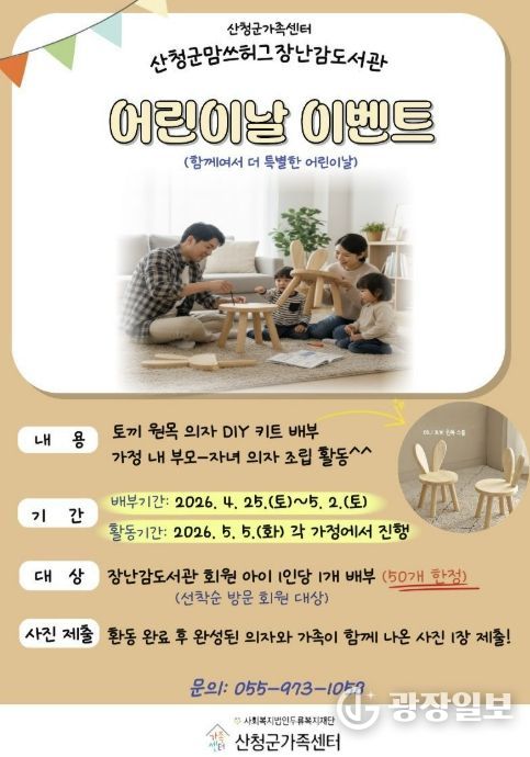 광장일보 주재영 기자 | 산청군가족센터는 어린이날을 맞아 ‘함께여서 더 특별한 어린이날’사업을 추진한다고 21일 밝혔다.