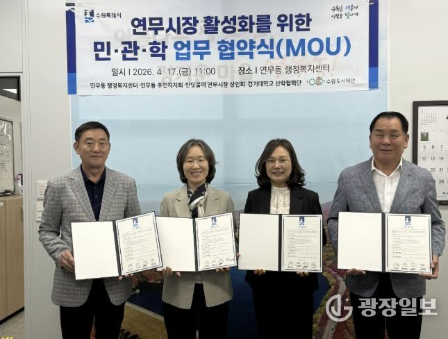 광장일보 박균현 기자 | 수원시 장안구 연무동 행정복지센터와 주민자치회, 반딧불이연무시장상인회, 경기대학교 산학협력단은 지난 17일, 각 기관의 긴밀한 상호 협력과 유대관계 강화를 위한 업무협약을 체결했다.