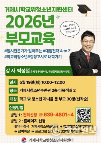 광장일보 주재영 기자 | 거제시학교밖청소년지원센터에서는 5월 19일 학교 밖 청소년 자녀를 둔 부모를 대상으로'2026년 학교 밖 청소년 부모교육'을 실시한다고 밝혔다.