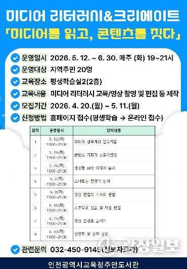 광장일보 주재영 기자 | 인천광역시교육청주안도서관은 시민의 디지털 역량 강화와 올바른 미디어 활용을 돕기 위해, 5월 12일부터 미디어 리터러시 교육 프로그램 ‘미디어를 읽고, 콘텐츠를 짓다’를 운영한다.