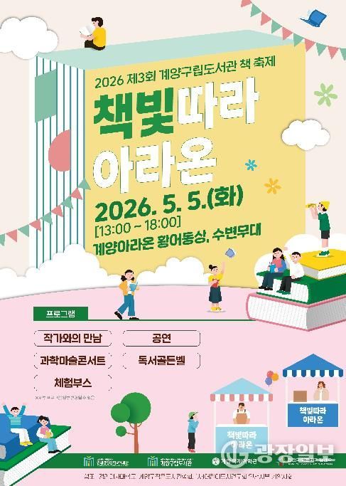 광장일보 주재영 기자 | (재)인천광역시계양구인재양성장학교육재단 계양구립도서관은 어린이날인 5월 5일 오후 1시부터 6시까지 계양아라온 황어동상 및 수변무대 일원에서 ‘제3회 계양구립도서관 책 축제 '책빛따라 아라온'’을 개최한다고 밝혔다.