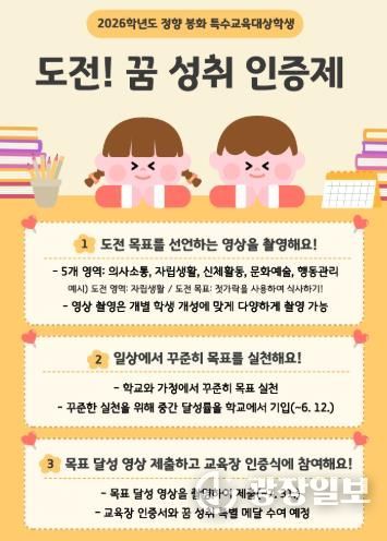 광장일보 주재영 기자 | 봉화교육지원청은 4월 20일 '장애인의 날'을 기념하여, 경상북도 내 최초로 특수교육대상학생의 특성을 반영해 전면 개편한 2026학년도 정향 봉화 특수교육대상학생 '도전! 꿈 성취 인증제' 참가 신청을 받고 본격적인 운영에 돌입한다고 밝혔다.