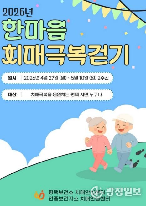 광장일보 주재영 기자 | 평택보건소 치매안심센터와 안중보건지소 치매안심센터에서는 지역 주민의 치매 예방과 인식개선을 위해 녪년 한마음 치매극복 걷기 행사’를 오는 4월 27일부터 5월 10일까지 2주간 진행한다.