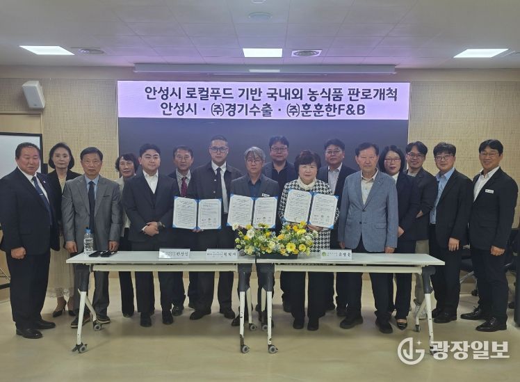 광장일보 주재영 기자 | 안성시 농업기술센터는 지난 4월 17일, 안성시 농특산물 및 농식품의 국내외 판로 확대를 위해 ㈜경기수출, ㈜훈훈한F&B와 전략적 업무협약(MOU)을 체결했다고 밝혔다.