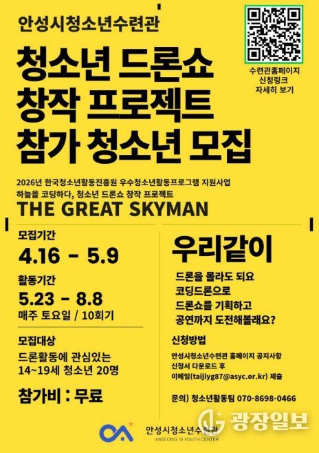 광장일보 주재영 기자 | 안성시청소년수련관은 미래 디지털 인재 양성을 위한 청소년 참여형 프로그램 '하늘을 코딩하다, 청소년 드론쇼 창작 프로젝트 ‘THE GREAT SKYMAN’'에 참여할 청소년을 4월 16일 ~ 5월 8일까지 모집한다고 밝혔다.