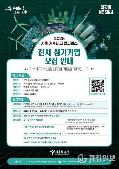 광장일보 주리아 기자 | 서울시는 4월 17일부터 5월 6일까지 ‘2026 기후테크 컨퍼런스’ 참여할 혁신 기업을 모집한다. “AI와 함께, 회복력 있는 도시를 만드는 기후테크”를 주제로 열리는 이번 행사는 환경의 달을 맞아 6월 25일~26일 이틀간 DDP 아트홀 2관에서 개최된다.