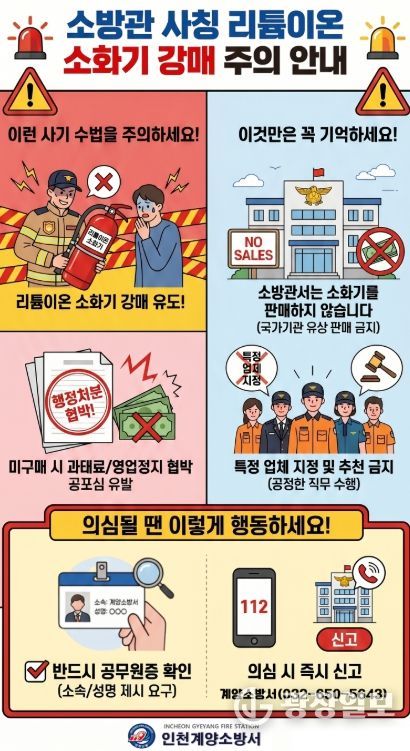 광장일보 주재영 기자 | 계양소방서는 최근 소방공무원을 사칭해 리튬배터리용 소화기 등 물품 구매를 요구하는 사기 행위가 발생하고 있다며 시민들의 각별한 주의를 당부했다.