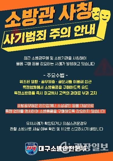 대구소방안전본부는 소방기관 명의의 구매·계약을 빙자한 연락을 받을 경우 즉시 응하지 말고, 반드시 해당 기관의 공식 대표번호를 통해 사실 여부를 확인해야 한다고 강조했다.