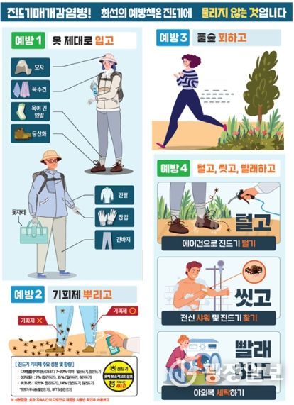 진드기 매개 감염병을 예방하기 위해서는 야외활동 시, 긴 옷과 팔토시, 장화 등을 착용해 피부 노출을 최소화하고, 작업 중 3~4시간마다 기피제를 뿌려야 한다. 특히, 풀밭에 앉거나 눕지 않고, 귀가 즉시 옷을 세탁하고 목욕을 하는 등 예방수칙을 준수하는 것이 중요하다.