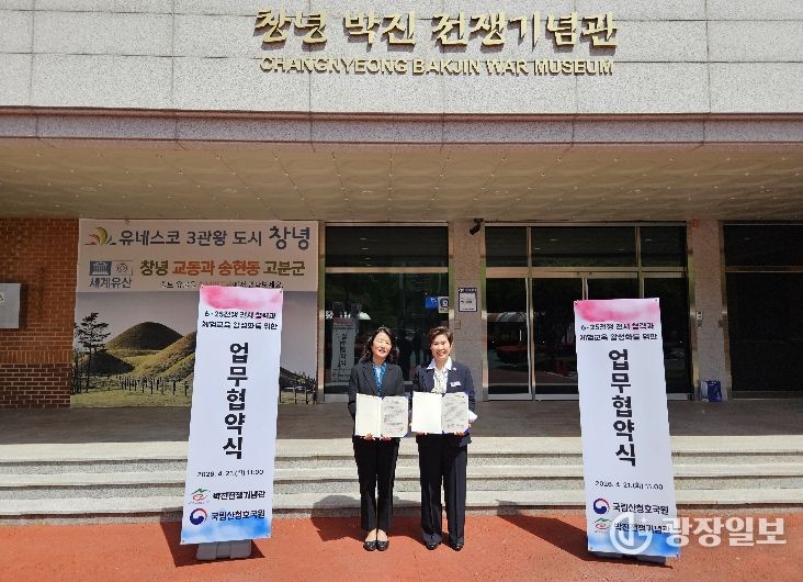 광장일보 주재영 기자 | 창녕군 박진전쟁기념관은 21일, 국립산청호국원(원장 김경나)과 업무협약을 체결하고, 6‧25전쟁의 역사적 가치 계승과 호국보훈 문화 확산을 위한 전시 및 교육 협력 체계를 구축했다.