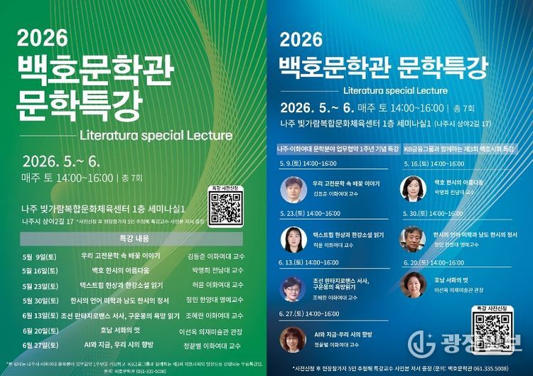 광장일보 주재영 기자 | 전남 나주시가 백호문학관에서 이화여자대학교와 함께 고전부터 현대, 미래 문학까지 아우르는 K-문학특강을 운영하며 시민 대상 문학 향유 기회를 확대한다.