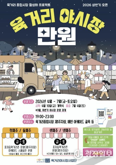 ‘육거리 야시장 만원’은 5월부터 첫째·둘째 주 금·토요일에는 이동식 판매대와 푸드트럭 중심의 ‘아케이드 스페셜존’, 셋째 주부터 월말까지 금·토요일에는 ‘포차존’ 콘셉트로 운영될 예정이다.