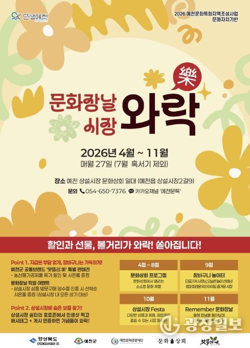 광장일보 주재영 기자 | (재)예천문화관광재단은 오는 4월 27일부터 11월까지 매달 27일, 예천 장날에 예천읍 상설시장 일대에서 ‘문화장날 시장와~락(樂)’을 개최한다.