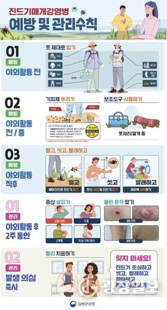이형정 시흥시보건소장은 “봄철 농작업과 등산, 산책 등 야외활동이 늘어나는 시기인 만큼 진드기 예방수칙을 철저히 준수해야 한다”라며 “의심 증상이 있으면 신속히 의료기관을 방문해 조기 진단과 치료를 받는 것이 중요하다”라고 강조했다.