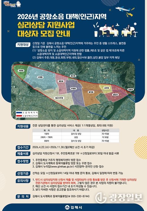 광장일보 주재영 기자 | 김해시는 공항소음 대책(인근)지역 주민을 대상으로 심리상담 지원사업 참여자를 모집한다고 22일 밝혔다.