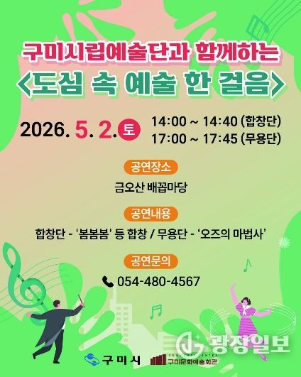 광장일보 주재영 기자 | 구미시는 가정의 달을 맞아 5월 2일 금오산 배꼽마당에서 구미시립예술단과 함께하는 야외공연 '도심 속 예술 한 걸음'을 개최한다.