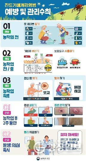 아울러 보건소는 봄철부터 가을까지 진드기 활동이 이어지는 만큼 농작업·산책·등산 등 일상적인 야외활동에서도 예방수칙 실천이 중요하다고 강조했다. 작업 전에는 기피제를 사용하고, 작업 시에는 긴 옷과 장갑·모자 등 보호구를 착용하며, 풀밭 위에 눕거나 옷을 벗어두는 행동은 피해야 한다. 또한 야외활동 후에는 즉시 샤워하고 작업복은 별도로 세탁하며, 귀가 후에는 몸에 진드기가 붙어있는지 꼼꼼히 확인할 것을 당부했다.