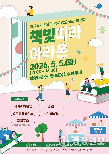 광장일보 주재영 기자 | (재)인천광역시계양구인재양성장학교육재단 계양구립도서관은 어린이날인 5월 5일 오후 1시부터 6시까지 계양아라온 황어동상 및 수변무대 일원에서 ‘제3회 계양구립도서관 책 축제 '책빛따라 아라온'’을 개최한다고 밝혔다.