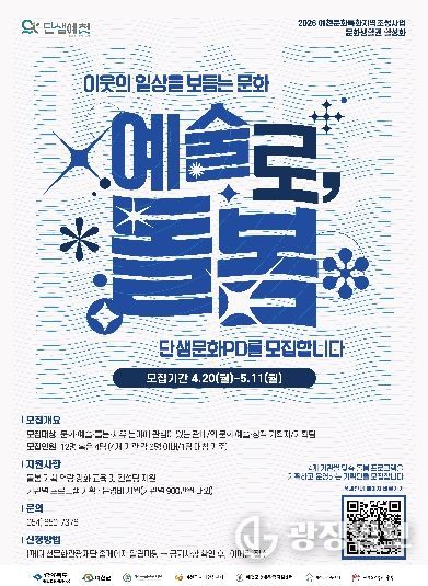 ‘단샘문화PD’는 지역 문화 프로그램을 직접 기획·운영하는 전문 인력으로, 이번 공모를 통해 '예술로, 돌봄' 사업의 핵심 기획자로 활동하게 된다.