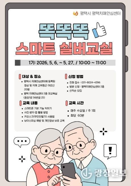 광장일보 주재영 기자 | 평택치매안심센터는 오는 5월 6일부터 27일까지 치매 예방 및 인지 기능 강화를 위한 ‘똑똑똑 스마트 실버교실’을 운영한다고 밝혔다.