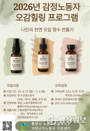 광장일보 주재영 기자 | 통영시는 관내 서비스업, 돌봄, 보건, 상담 등 다양한 직군의 감정노동자들의 마음 치유와 휴식에 초점을 맞춰 ‘2026년 감정노동자 오감힐링 프로그램’을 통영시노동자종합복지관에서 운영한다고 22일 밝혔다.