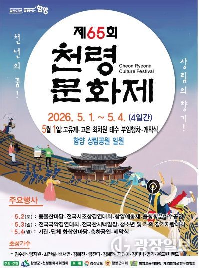광장일보 주재영 기자 | 함양군을 대표하는 종합문화축제 ‘제65회 천령문화제’가 오는 5월 1일부터 4일까지 4일간 천년의 숲 상림공원 일원에서 열린다.