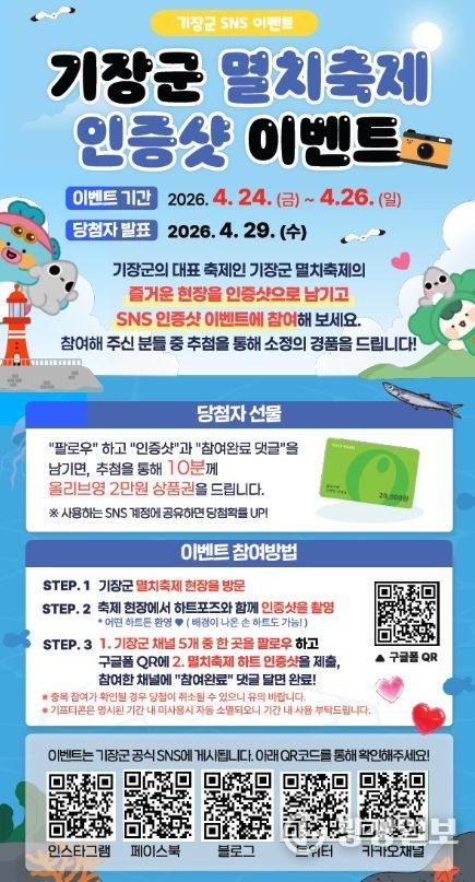이번 이벤트는 기장군을 대표하는 축제인 기장멸치축제를 찾는 관광객들이 보다 즐겁게 축제를 체험하고, 기장군 공식 SNS 채널을 통해 군정 소식을 보다 친근하게 접할 수 있도록 기획됐다.