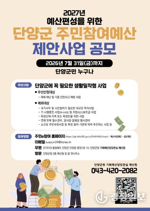 광장일보 이현나 기자 | 단양군은 군민이 예산편성 과정에 직접 참여해 지역에 꼭 필요한 사업을 제안할 수 있도록 ‘2027년 예산편성을 위한 주민참여예산 제안사업 공모’를 실시한다고 밝혔다.