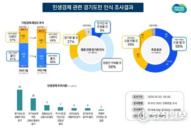 정두석 경기도 기획조정실장은 “가정 경제 형편이 두 달 만에 급격히 나빠졌다는 조사 결과는 현재 민생 현장의 어려움을 보여준다”며 “추경 예산이 빠르게 집행될 수 있도록 도의회와 긴밀히 협의하여 고유가와 고물가로 고통받는 도민들의 부담을 덜어드리도록 하겠다”고 밝혔다.