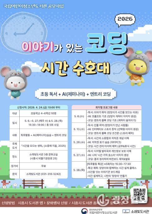 광장일보 주재영 기자 | 시흥시 소래빛도서관은 국립어린이청소년도서관이 주최하는 ‘2026년 이야기가 있는 코딩’ 공모사업 운영기관으로 선정돼 오는 5월 6일부터 어린이 대상 독서·디지털 융합 프로그램을 운영한다.