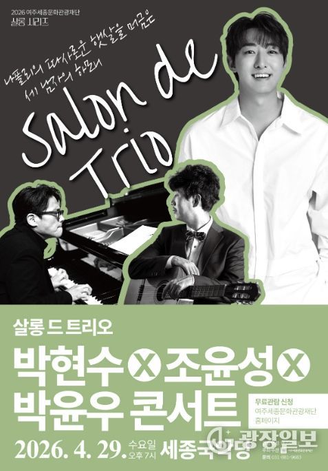 광장일보 주재영 기자 | 여주세종문화관광재단이 오는 29일, 문화가 있는 날을 맞아 2026년 특별기획 살롱 시리즈의 세 번째 무대 '살롱 드 트리오 박현수X조윤성X박윤우 콘서트'를 세종국악당에서 개최한다.